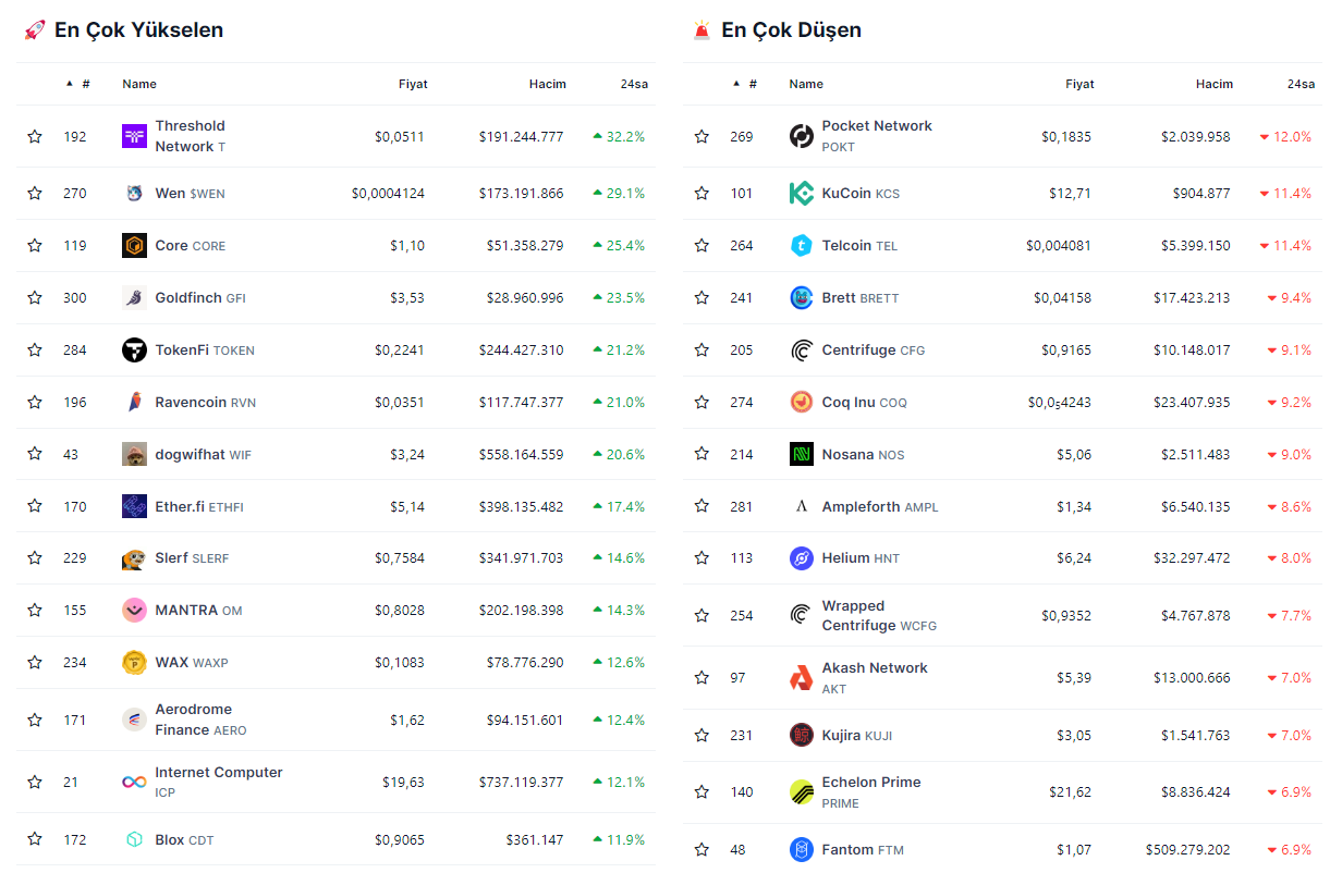Hadi gelin bugünün en çok yükselen ve düşen altcoin’lerine birlikte göz atalım: