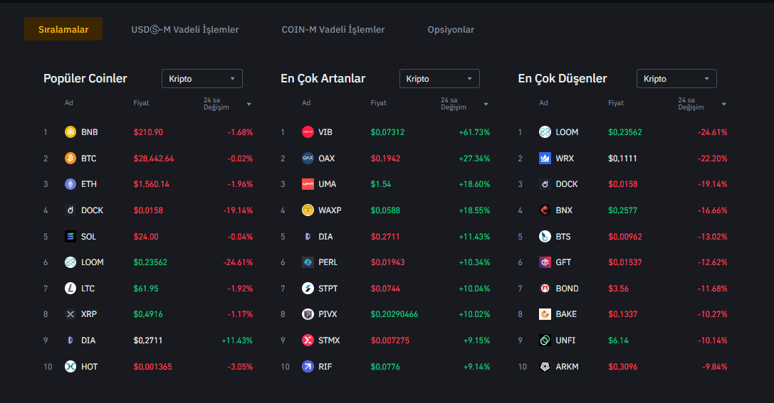 Yukarıdaki tabloda Binance borsasında listelenmiş altcoin’lerin son 24 saat içerisindeki performansları yer alıyor. Görüldüğü gibi altcoin’ler kendi iç dinamiklerine göre hareketleri hareket etmekte.