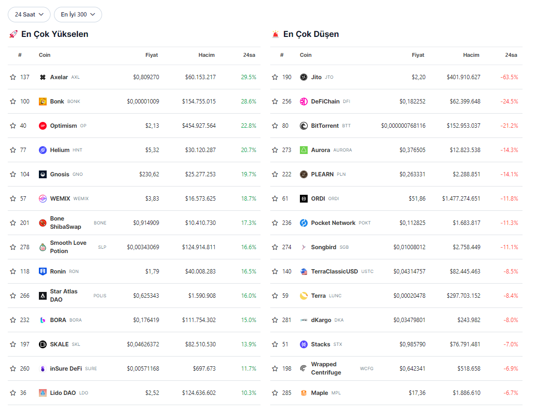 AXL haricinde BONK, OP, HNT, GNO ve WEMIX’in de kayda değer sıçramalar gerçekleştirdiği görüldü.