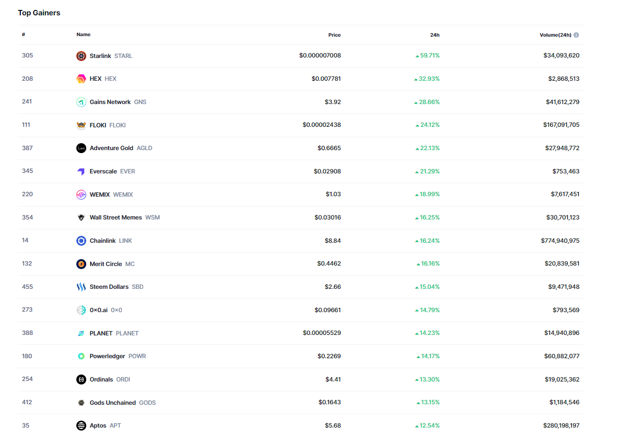 Başarılı bir veri sağlayıcısı olan CoinMarketCap’in aktardığı bilgilere göre piyasa değerine göre ilk 500 kripto para birimi içerisinde en büyük yükselişi Starlink (STARL) isimli altcoin gerçekleştirdi.
