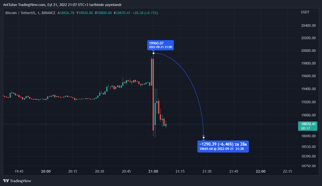 75 baz puanlık bir faiz artışı gerçekleştiren FED, lider kripto para biriminin 1 dakika içerisinde 20 bin dolardan 18.670 dolara kadar yüzde 7’ye yakın değer kaybetmesine neden oldu.