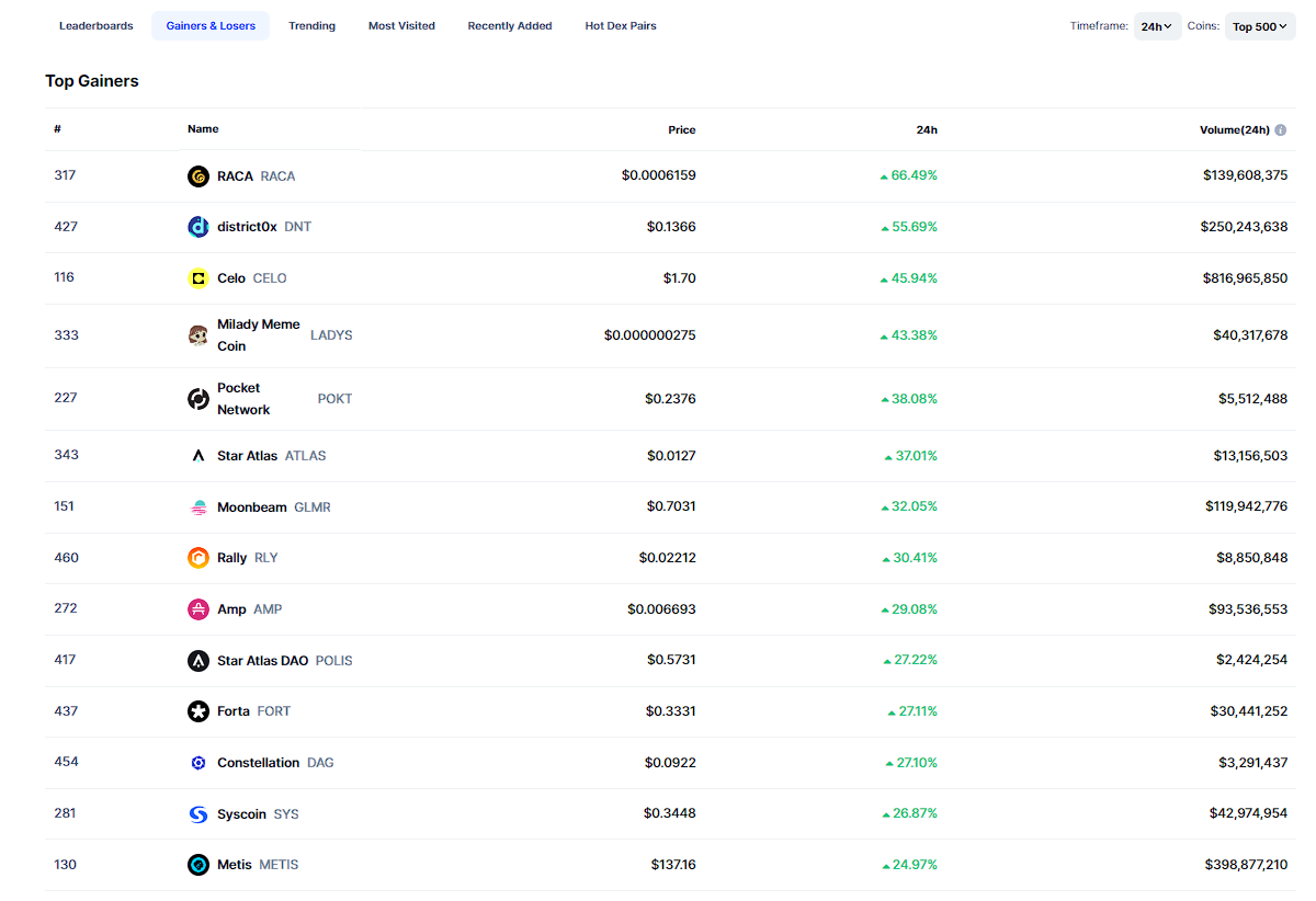 Başarılı bir veri sağlayıcısı olan CoinMarketCap’in verilerine göre ilk 500 kripto para birimi içerisinde bugünün en çok kazandıran altcoin‘i RACA (RACA) oldu. RACA son 24 saat içerisinde %65’lik artış yaşadı.