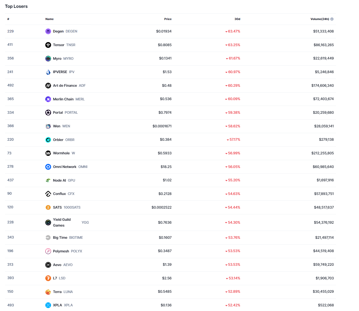 - DEGEN son 1 ay özelinde %63 oranında değer kaybederken, DEGEN’i sırasıyla TNSR, MYRO, IPV, ADF ve MERL takip etti. Bu 6 altcoin bu ay %60 oranından daha fazla düşüş yaşadı.