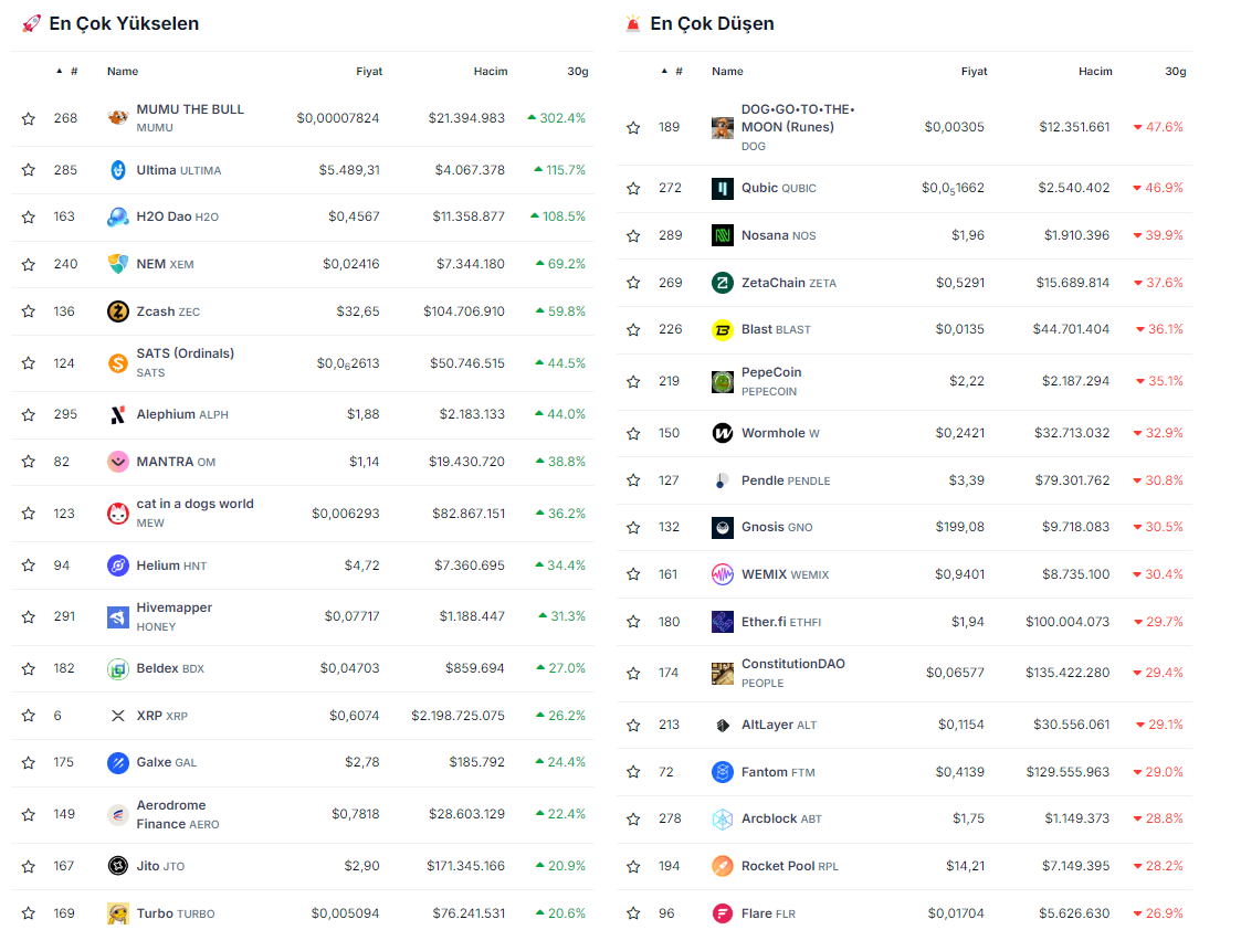 MUMU haricinde ULTIMA ve H2O’nun da %100’den fazla artış yaşadığı görüldü. XEM, ZEC, SATS, ALPH ve OM‘un da bu ay kayda değer artışlar yaşadığı görüldü.