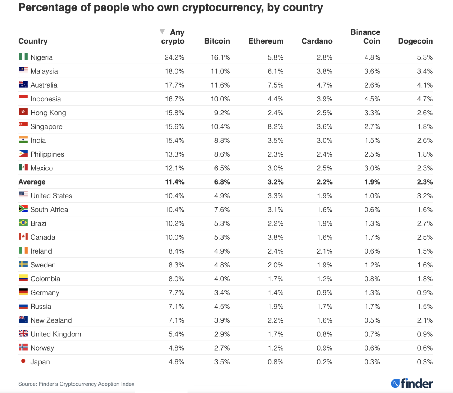 Anket sonuçlarına göre, kripto para birimlerini nüfusa oranla en fazla benimseyen ülke, %24.2 ile Nijerya ilk sırada yer alıyor. İkinci sırada %18 ile Malezya yer alırken, Avustralya %17.8 oranla üçüncü sırada yer alıyor. ABD %10.4 ila 10. sırada yer alırken, Japonya yetişkinlerin %4.6 kripto varlıklara sahip olmasıyla en düşük benimsemeye sahip ülke olarak karşımıza çıkıyor.