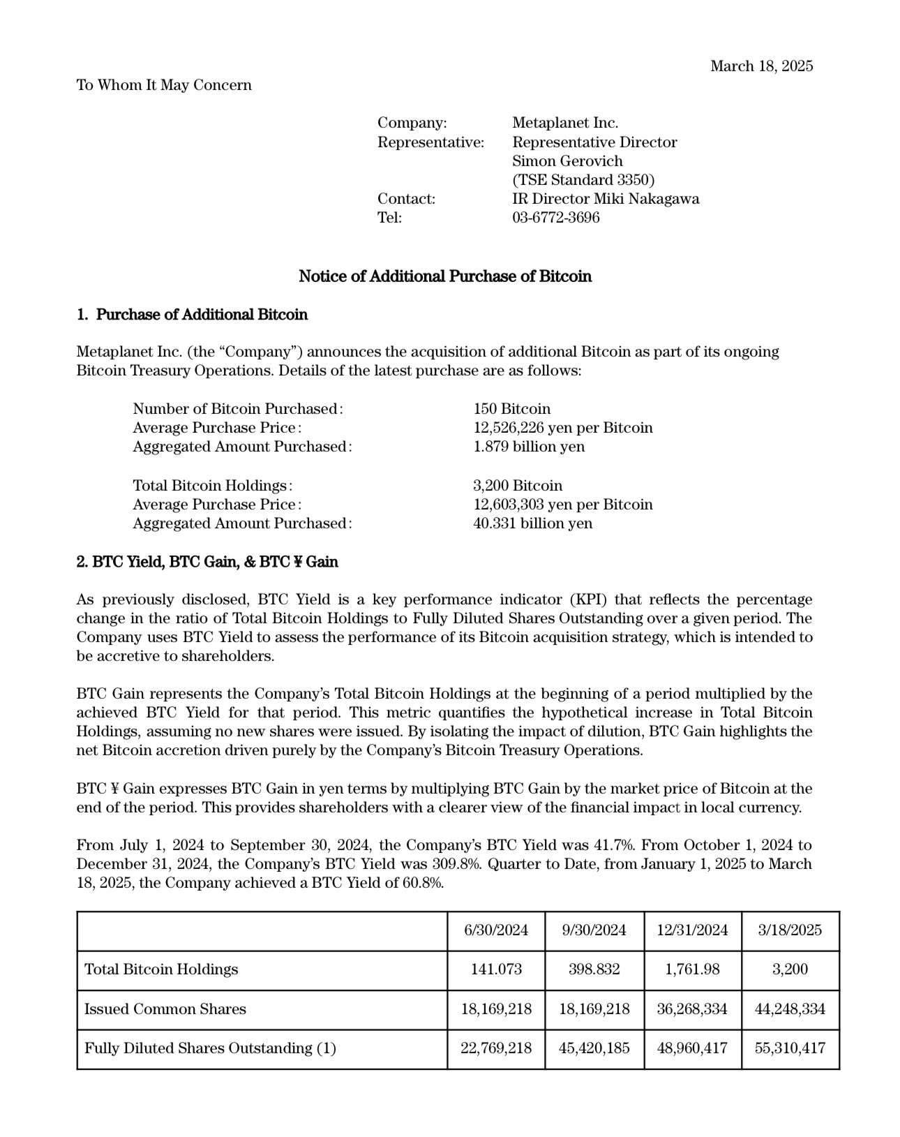 Japonya’nın Strategy’si olarak adlandırılan Metaplanet, düzenli olarak Bitcoin (BTC) satın alımları yapıyor. Kısa süre önce X hesabı üzerinden yeni bir gönderi paylaşan şirket, 150 adet BTC daha aldığını duyurdu. İşte Metaplanet’in son Bitcoin satın alımına ilişkin duyurusu: