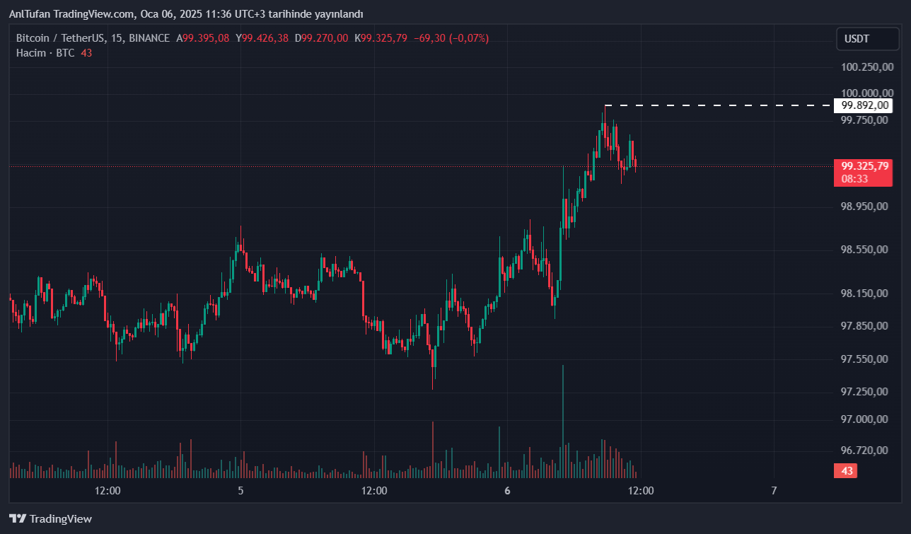 Bitcoin haberimizin yazıldığı esnada her ne kadar 99.300 dolar seviyelerinden işlem görüyor olsa da, geçtiğimiz saatlerde Binance spot piyasada 99.892 dolar seviyelerine kadar yükselmişti.