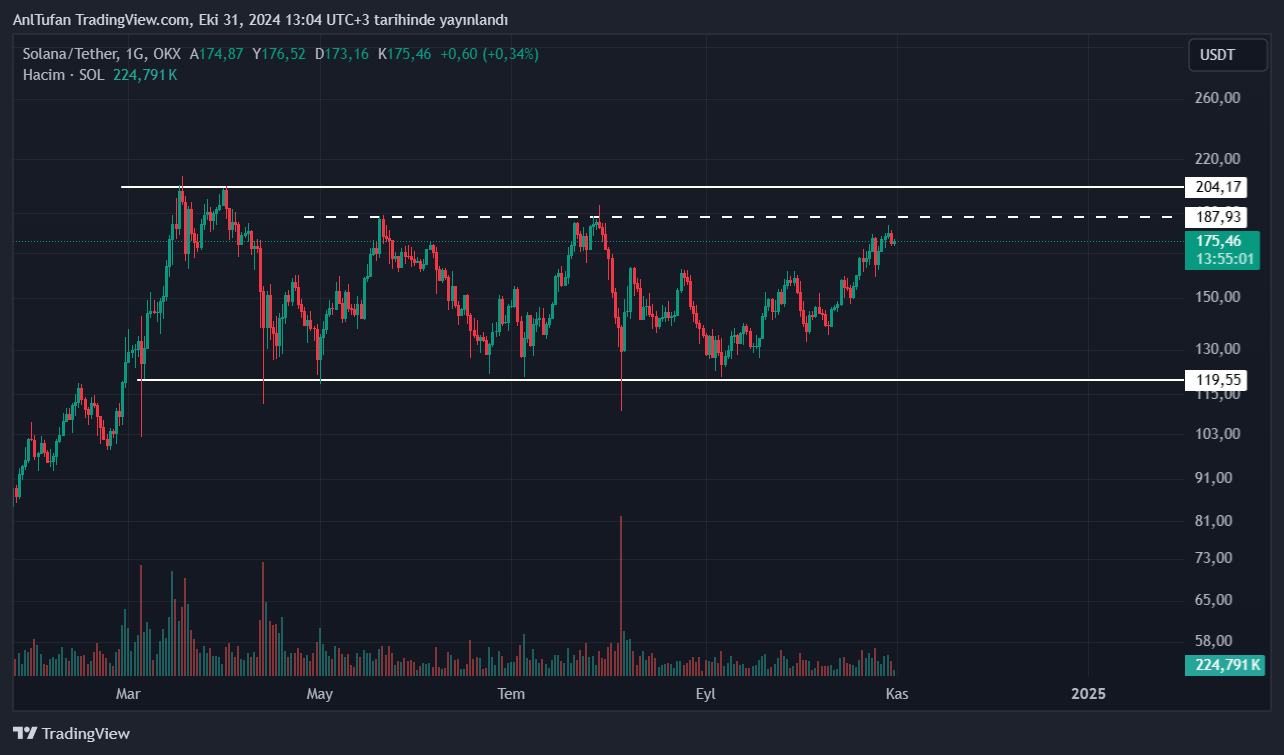SOL’un bu direnç bölgesini aşması ATH seviyesi olan 260 dolara kadar bir yükseliş getirebileceği gibi direncin kırılamaması popüler altcoin’de düşüş getirebilir.