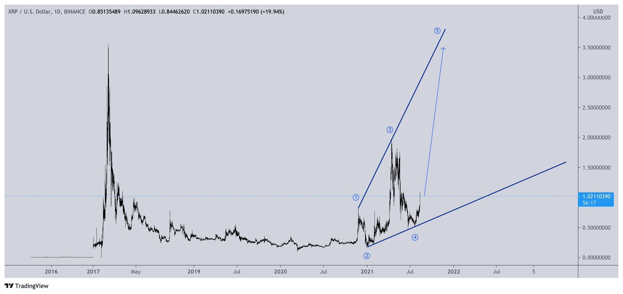 “Aşağıdaki XRP grafiği, Ağustos ayında XRP ile ilgili yaptığım son YouTube videomdan. ALTINDAKİ grafik, bugün karşılaştığım aynı yapıya sahip ancak halihazırda devam eden 5. dalga ile bir adım önde olan başka bir madeni para. Şimdi görüyor musun?”