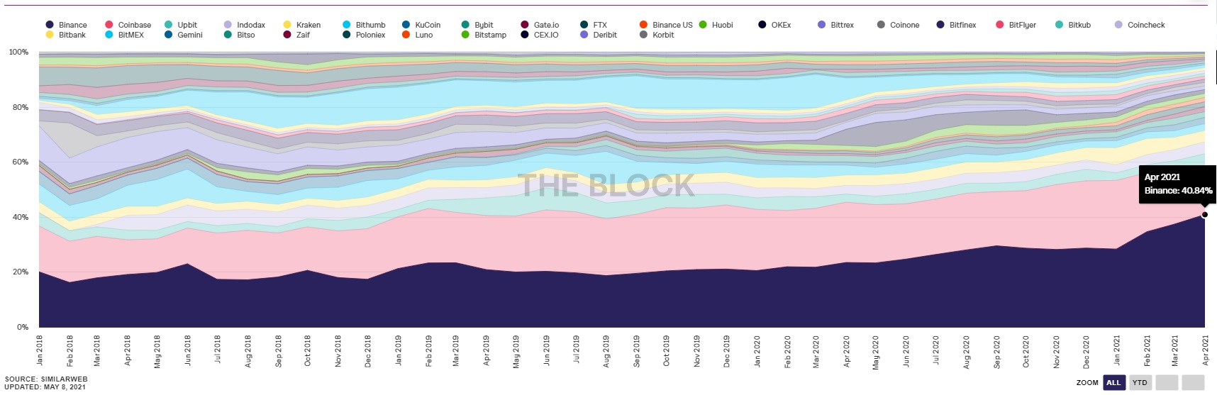 Sonuçlara göre bireysel pazar payında rekor kıran Binance, aylık trafik payını %40,84’e yükseltirken Coinbase %17,65’e yükseltti.