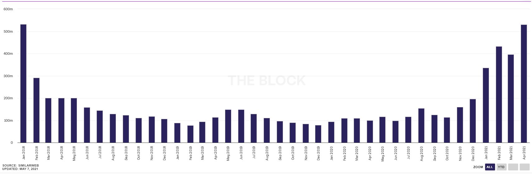 SimilarWeb’den alınan verilere göre dünyanın en büyük kripto para borsalarının sadece Nisan ayında 530 milyon ziyaretçiye ev sahipliği yaptığı görülmekte.
