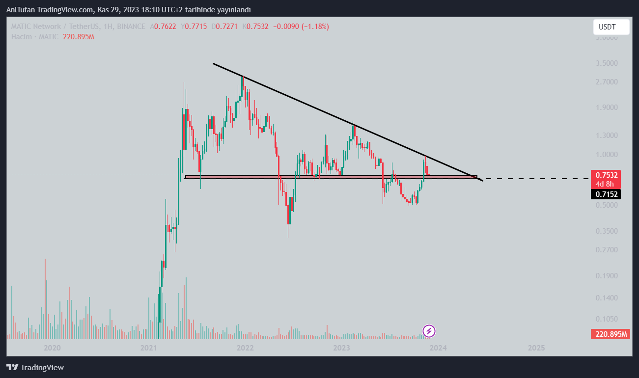 Polygon (MATIC) haberimizin yazıldığı esnada 0.75 dolar seviyelerinden işlem görüyor. MATIC her ne kadar 3 hafta önce 0.98 dolara kadar yükselse de, düşen trendini kırmayı başaramadı.