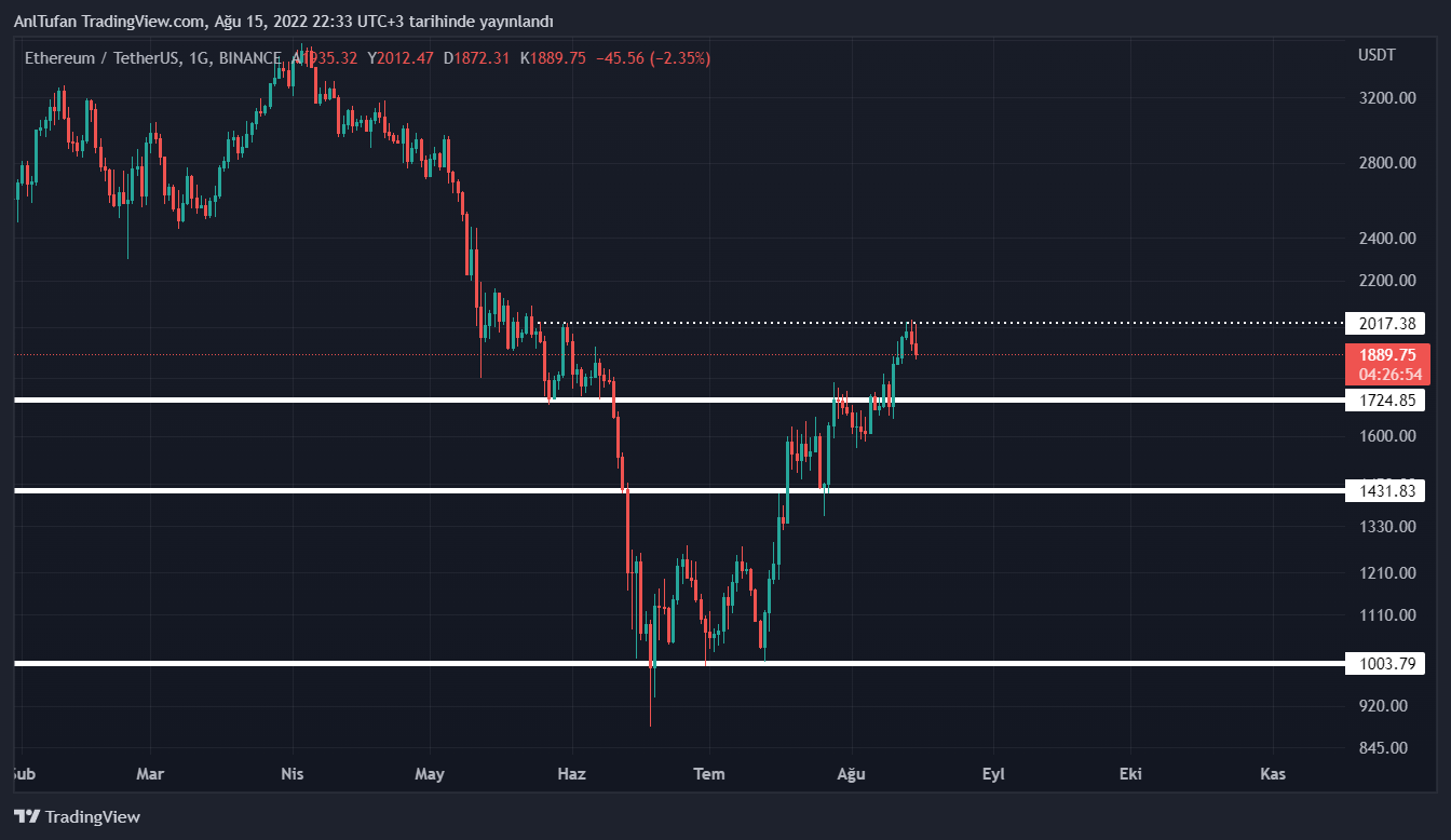 Yayın saati itibariyle 1890 dolar seviyelerinde yer alan lider altcoin Ethereum, 2000 dolar direncinden sert bir şekilde reddedildiği görülüyor.