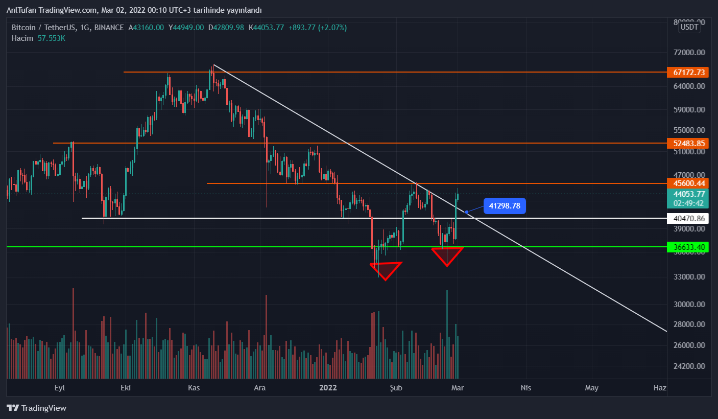 Günlük kapanışını 45.000 – 45.500 dolar aralığının üzerinde yapması halinde sert bir yükseliş mumu gerçekleştirebilecek olan Bitcoin, bu direncin kırılamaması durumunda ise 41.300 – 40.500 dolar aralığına bir geri çekilme yaşayabilir.