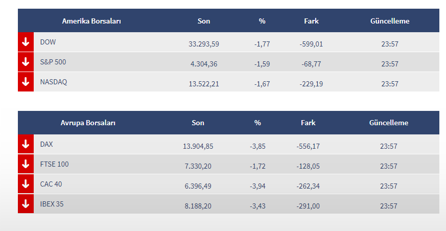 ABD’nin en büyük piyasa endeksleri olan S&P 500, Nasdaq ve Dow Jones’da büyük geri çekilmeler meydana gelmekte.
