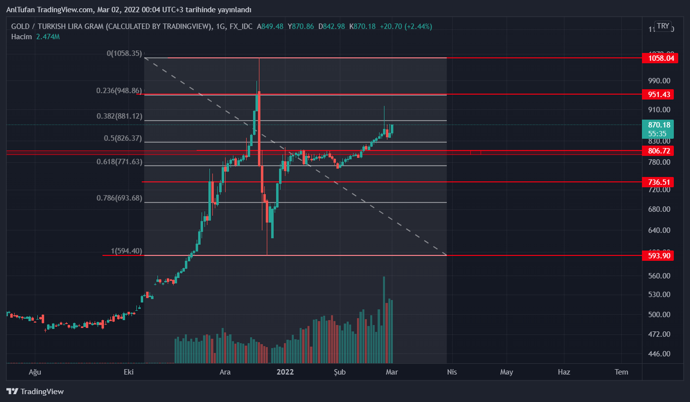 Önemli direnç seviyesine ulaşan altın, 880 Türk lirası üzerinde günlük kapanış yaptığı takdir de daha üst seviye olan 950 – 1050 Türk lirası aralığında bulunan direnç seviyesini kendine hedef edinebilir.