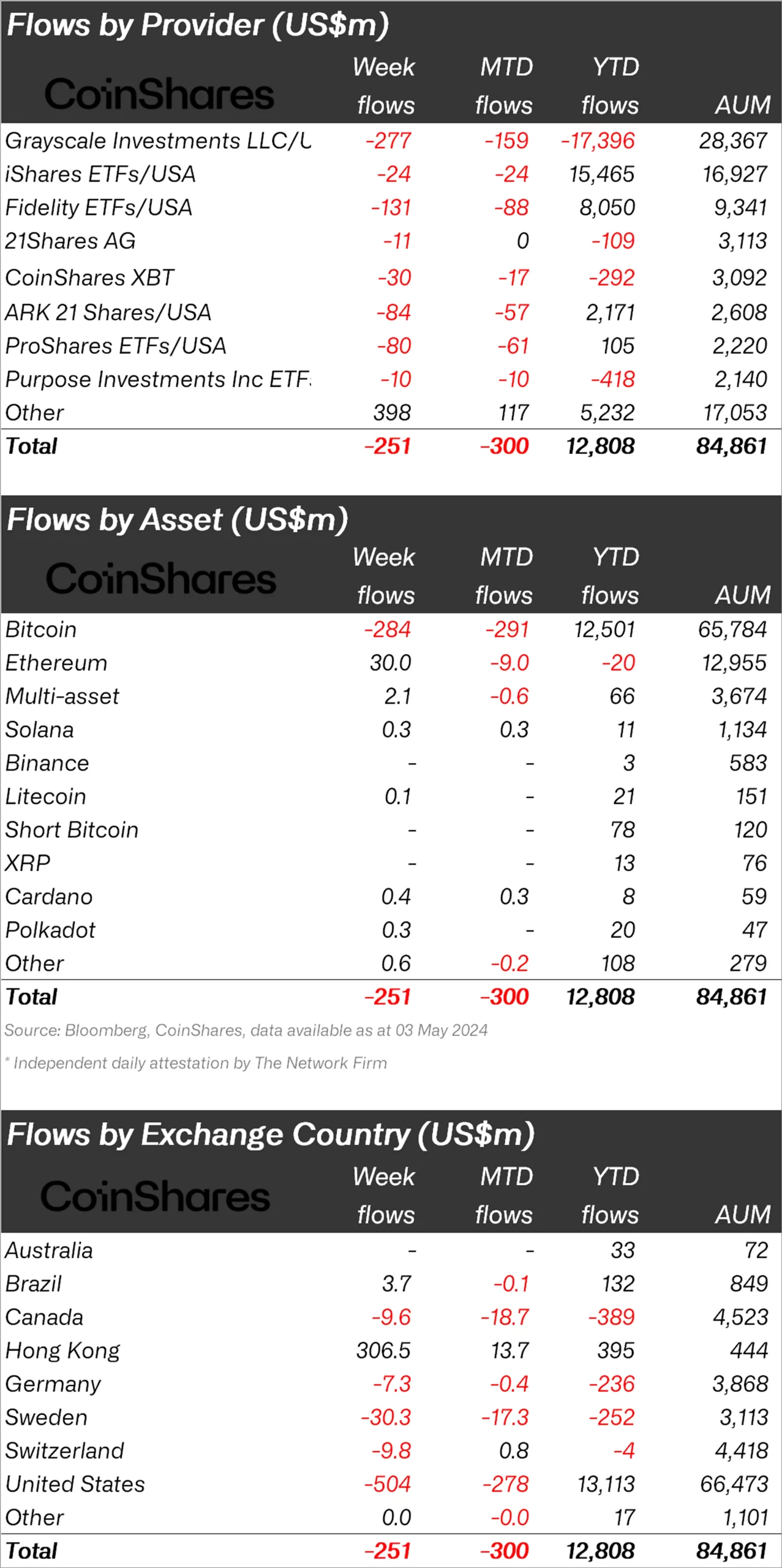Bitcoin yine ana odak noktasıydı ve 284 milyon dolarlık çıkış görüldü. Alışılmadık bir şekilde, BTC geçtiğimiz hafta çıkış gören tek dijital varlık oldu.