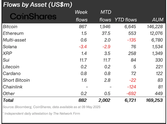 Geçtiğimiz hafta dijital varlık yatırım ürünlerine 882 milyon dolarlık giriş oldu. Bu, üst üste dördüncü hafta pozitif giriş yaşandığını gösterirken, yıl başından bu yana toplam giriş miktarı 6,7 milyar dolara ulaştı.