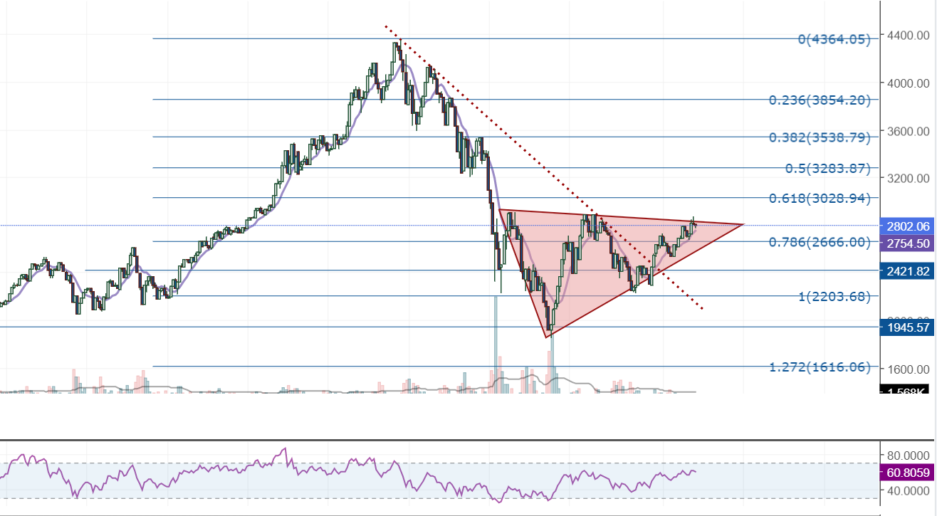 Arkasına pozitif akışları alan ETH/USD gün içerisinde 3.000 seviyelerine doğru hareketlendi. 4 saatlikte formasyon direncini zorlayan kripto para birimi 2.900-3.000 bandını kırabilirse 3.280 ve 3.530 seviyeleri takip edilebilir.