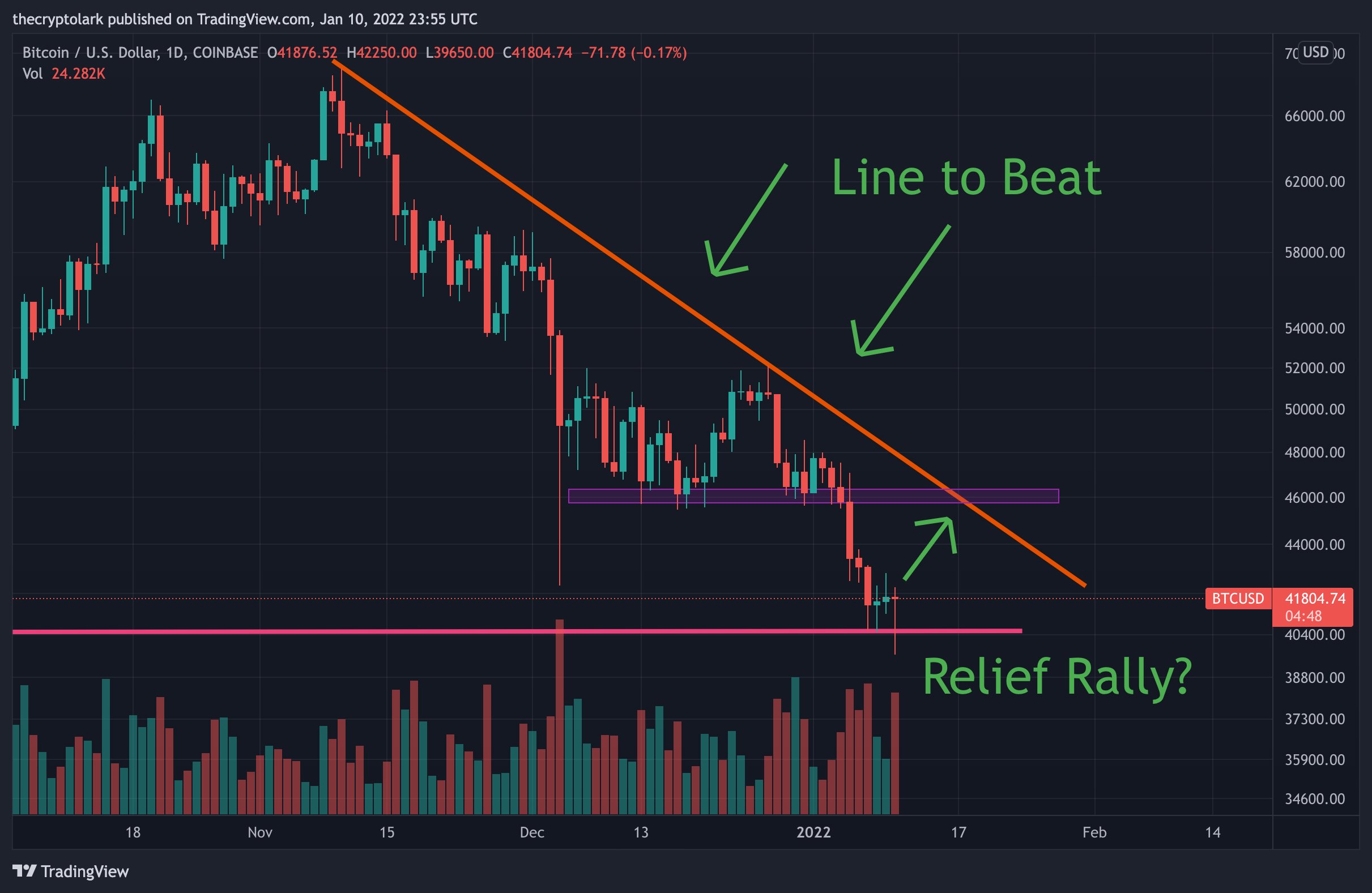 Bitcoin’in ilerleyen günlerde 45.500 – 46.000 dolar seviyelerinde bulunan mor kutuya bir yükseliş yapacağını düşünen Lark, grafiğinde turuncu ile belirttiği düşen trendin kırılmadan mini ayı sezonunun bittiğinin düşünülmemesi gerektiğini söylüyor.