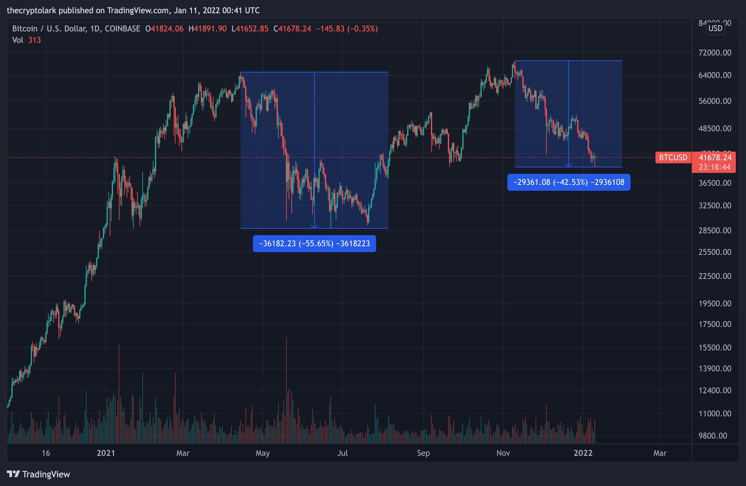 Geçtiğimiz “mini ayı” sezonunda %55 düşüş yaşayan Bitcoin, şuan için sadece %42’lik bir düşüş yaşamış durumda.
