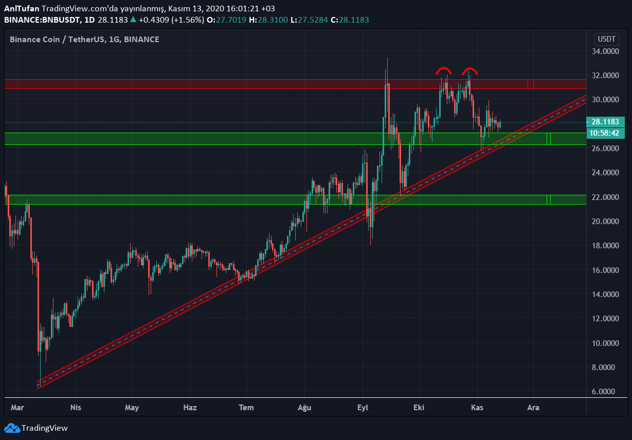 Binance Coin, 14 Ekim ve 27 Ekim tarihlerinde ikili tepe yaptıktan sonra 25.75 dolar desteğine kadar bir geri çekilme yaşadı. Mart aylarından gelen çok güzel bir yükselen trend çizgisi bulunan BNB’nin 27 dolar seviyelerinde destek bulduğunu söyleyebiliriz. İlerleyen günlerde yükselen trendini aşağı yönlü kırmadığı taktirde 32 dolar direncini denemesi çok olası gözüküyor.
