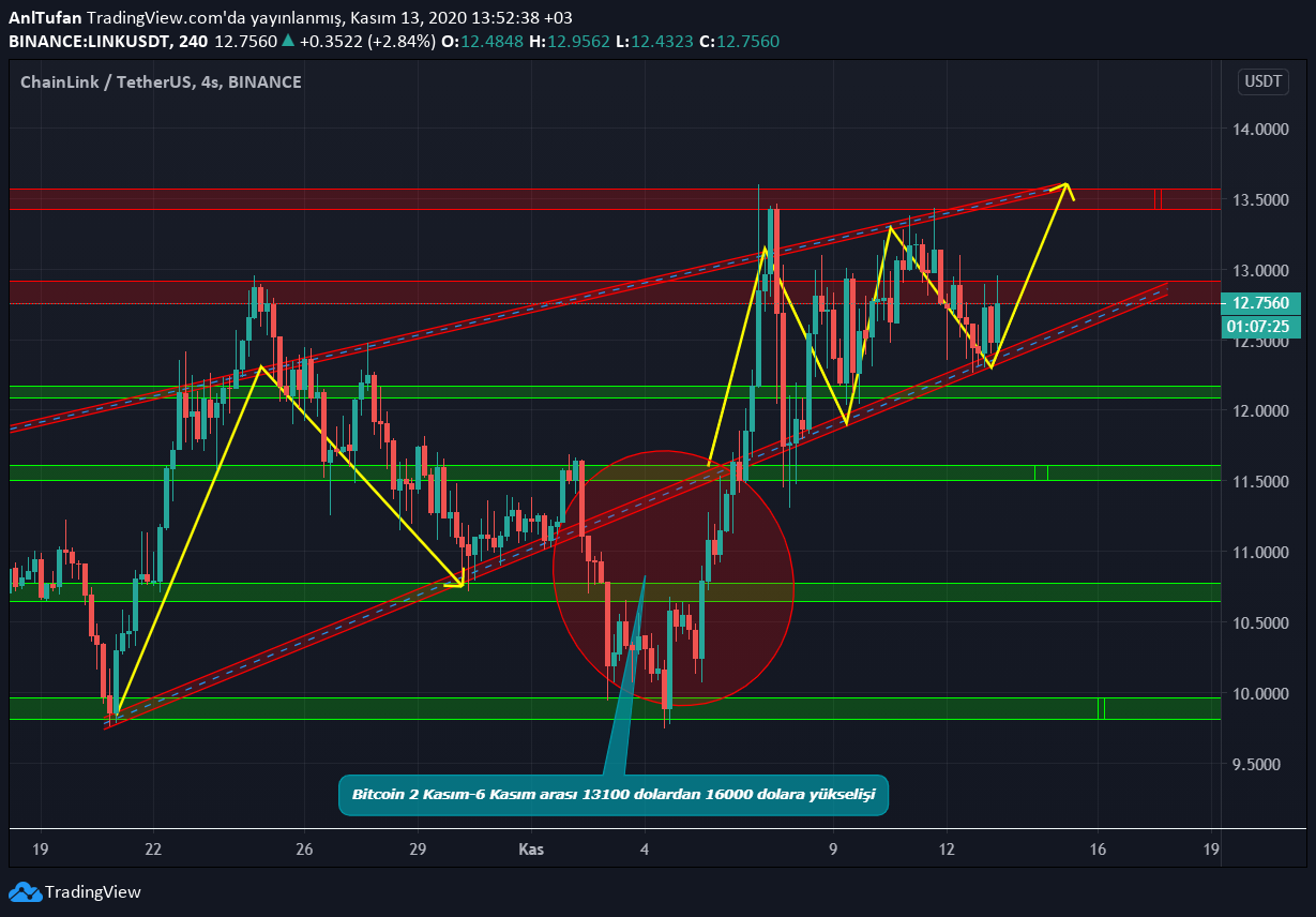 Kanal içerisinde bir aşağı bir yukarı hareket eden LINK’in şimdiki hareketi 12.80 dolar direncini aşıp, 13.50 dolar direncine yükselmek olacaltır.