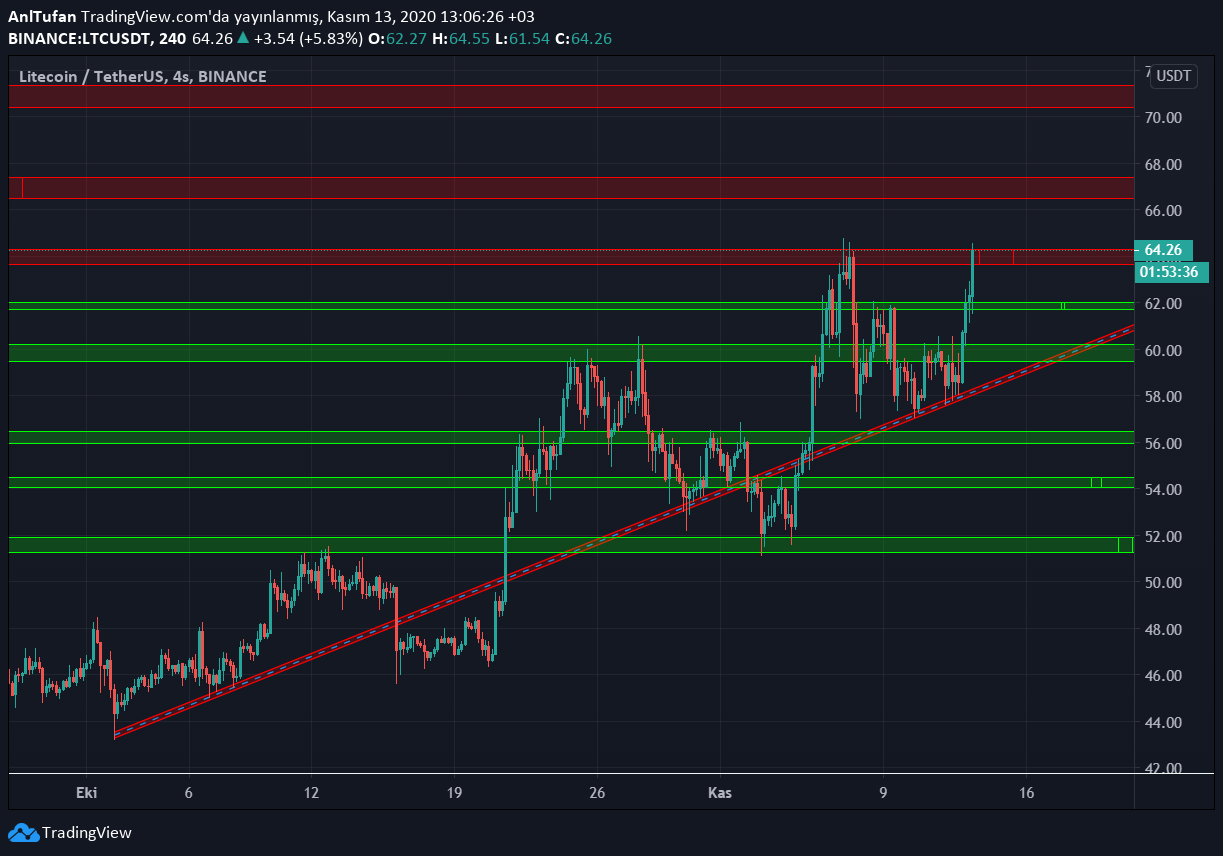 Demirbaş altcoinler’den biri olan Litecoin, 4 saatlik görünümde önemli bir direnç seviyesinde işlem görüyor. 64.47 üzerine iğneler atmış olsa da hala üzerinde kapanış yapamayan Litecoin, bu sefer bu seviyenin üstünde kalacak gibi duruyor.