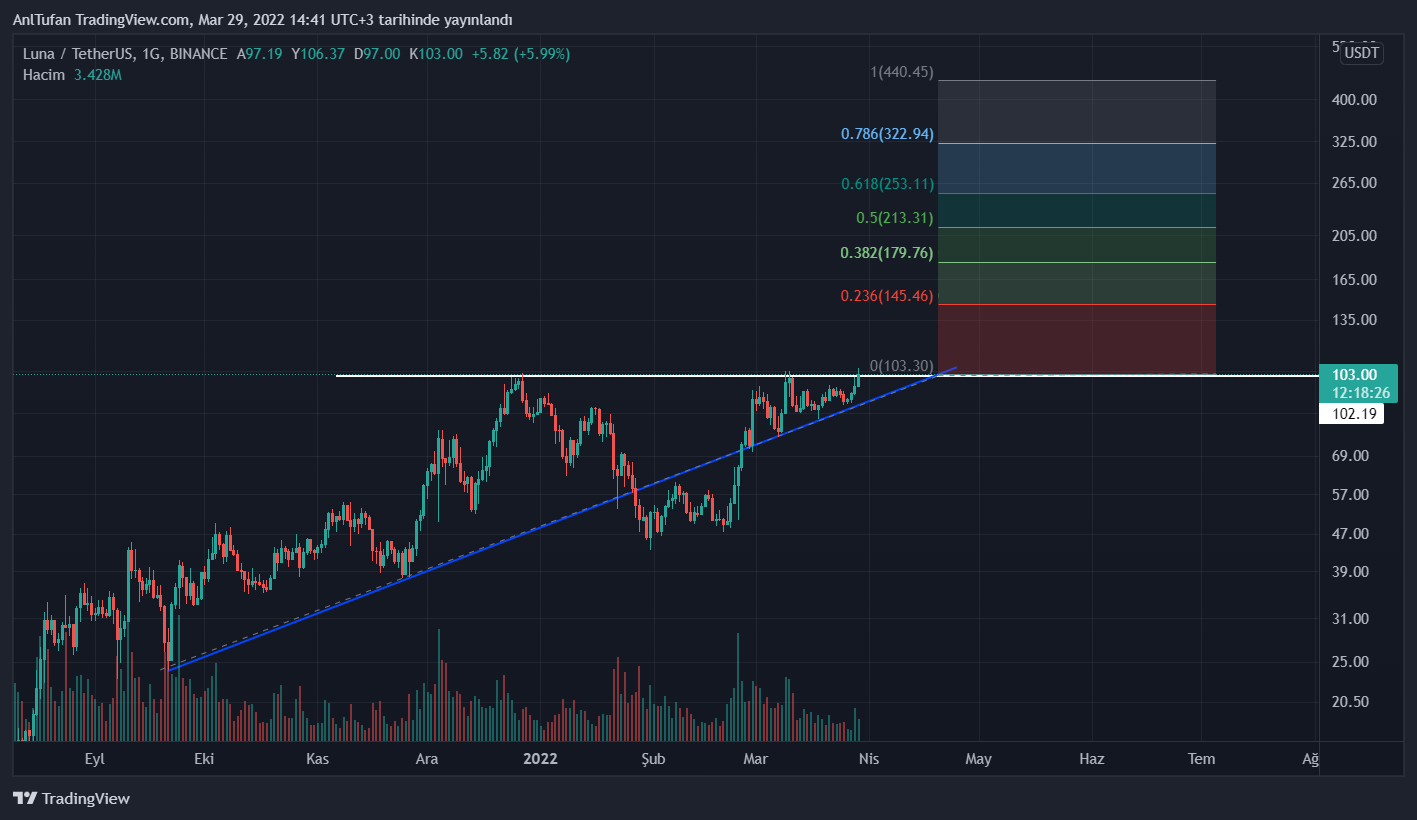 Yükselişin kısa sürmesi halinde 0.236 fibonacci seviyesi olan 145 dolara ve 0.382 fibonacci seviyesi olan 180 dolara kadar yükseliş yapabilecek olan LUNA, yükselişin sertleşmesi halinde 0.5 fibonacci seviyesine ve 0.618 fibonacci seviyesine yükselebilir.