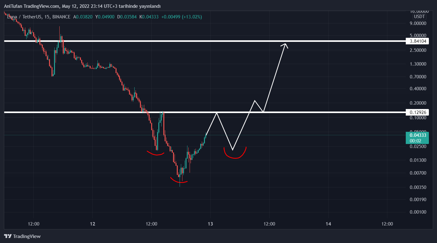 Binance borsasında delist edilmediği sürece halen bir umut ışığı görülen LUNA, an itibariyle 15 dakikalık grafikte trend dönüş formasyonu olan TOBO oluşturuyor olabilir.