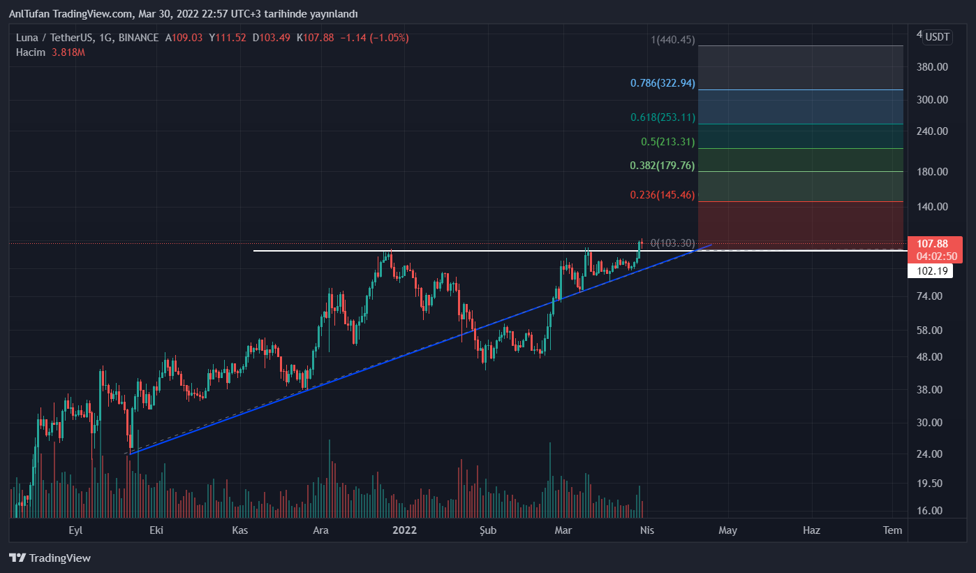 Bu fibonacci uzantısına göre LUNA kısa vadede 145 dolar ve 180 dolar seviyelerine kadar yükseliş sergileyebilir.