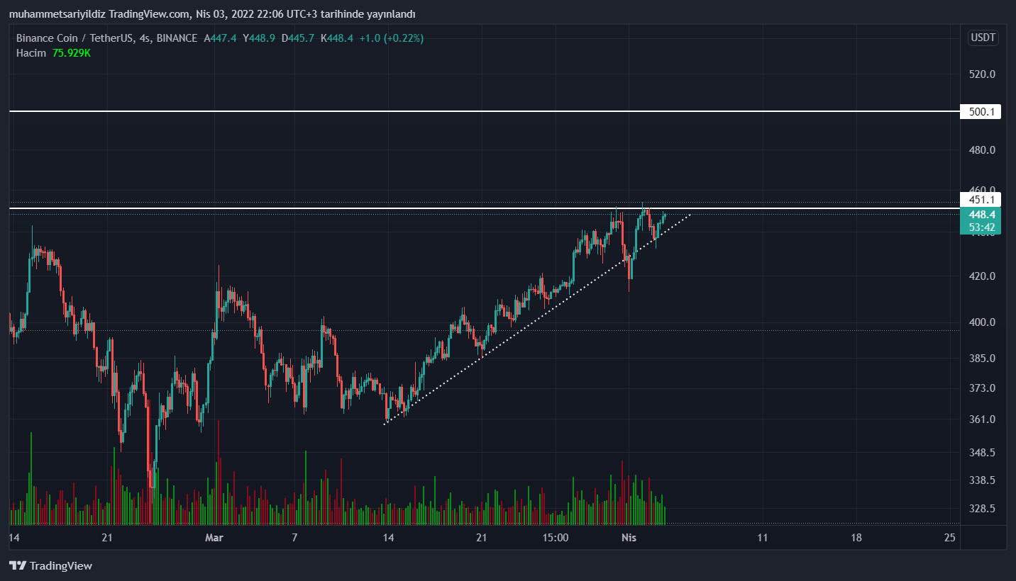 Yükselen trendinin üzerinde bulunmaya devam eden BNB, halen 450 dolar major direnç seviyesini kıramamış gibi gözükmekte.