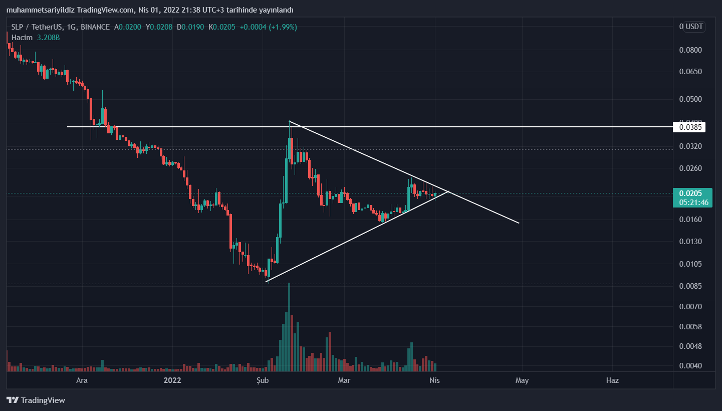MANA’ya ziyade halen düşen trendini kıramamış olan SLP, 0.022 dolar seviyesinde bulunan trendini kırmasının ardından yükselişe başlayabilir.