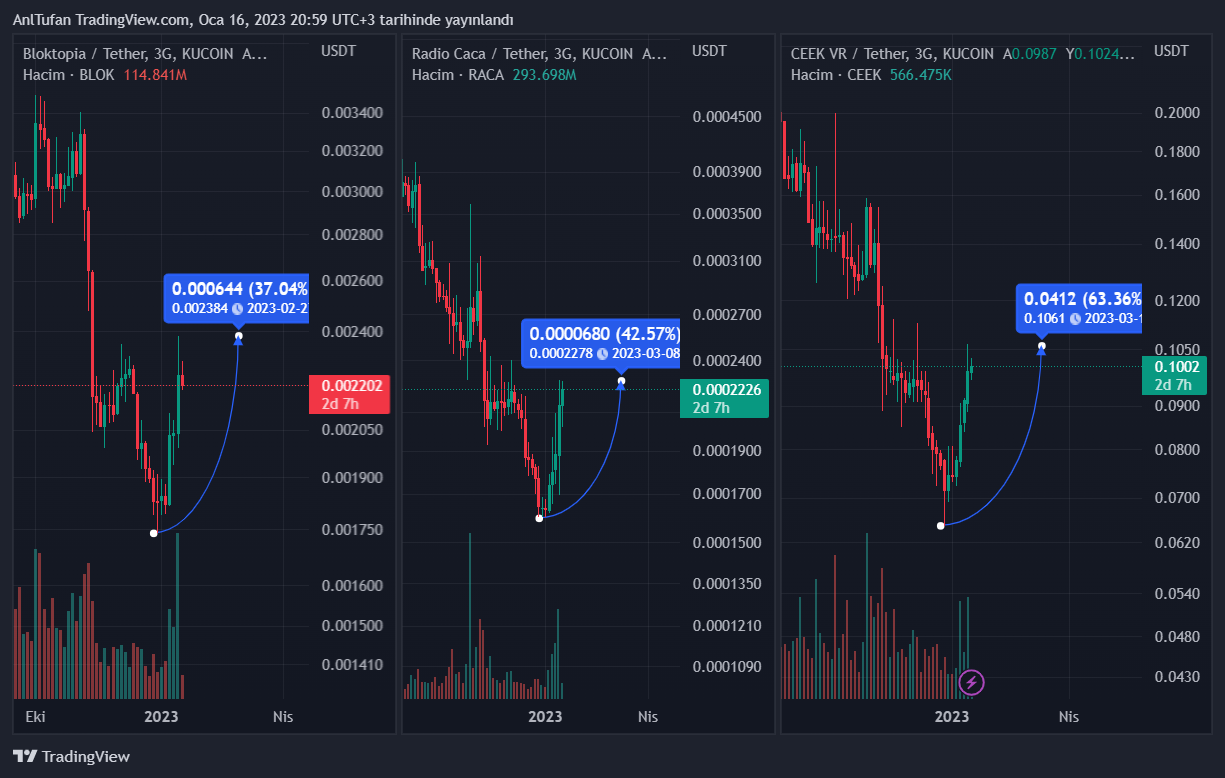 Son dönemlerde yaşanan yükselişleri analiz ettiğimizde CEEK, RACA ve BLOK‘un dip seviyeden yüzde 35-65 aralığında bir yükseliş yaşadığı gözlemleniyor. Piyasa değeri MANA, GALA ve SAND’a göre çok daha düşük olan bu altcoin’lerde henüz beklenen yükselişler meydana gelmemiş durumda.