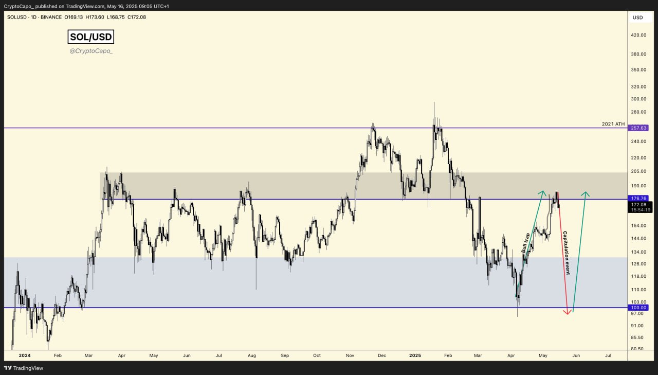 Crypto Capo’ya göre SOL, önümüzdeki günlerde 100 dolar seviyelerine kadar gerileyecek 100 dolarda SOL’un tutunacağını ve toparlanacağını düşünen Capo, yine de bu çöküşün kaçınılmaz olduğuna inanıyor.