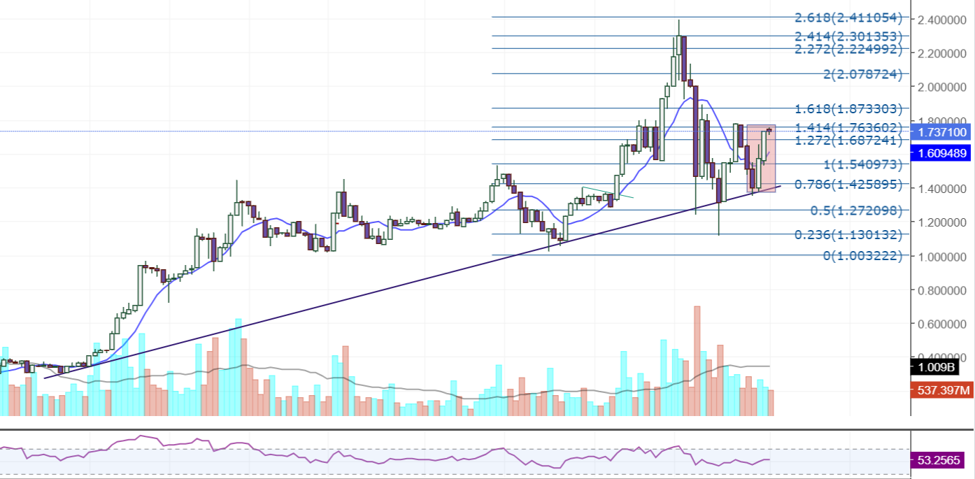 Günlük grafikte trend desteğinden toparlayan ve 1,7636 direncini test eden ADA/USD aşırı satım bölgesinden çıkış yaptı. Direnci kırması durumunda aşırı alım bölgesindeki ilerleyişini sürdürmesi beklenen kripto para biriminde 1,8733, 2,0000 ve 2,2250 seviyeleri kademeli olarak takip edilebilir.