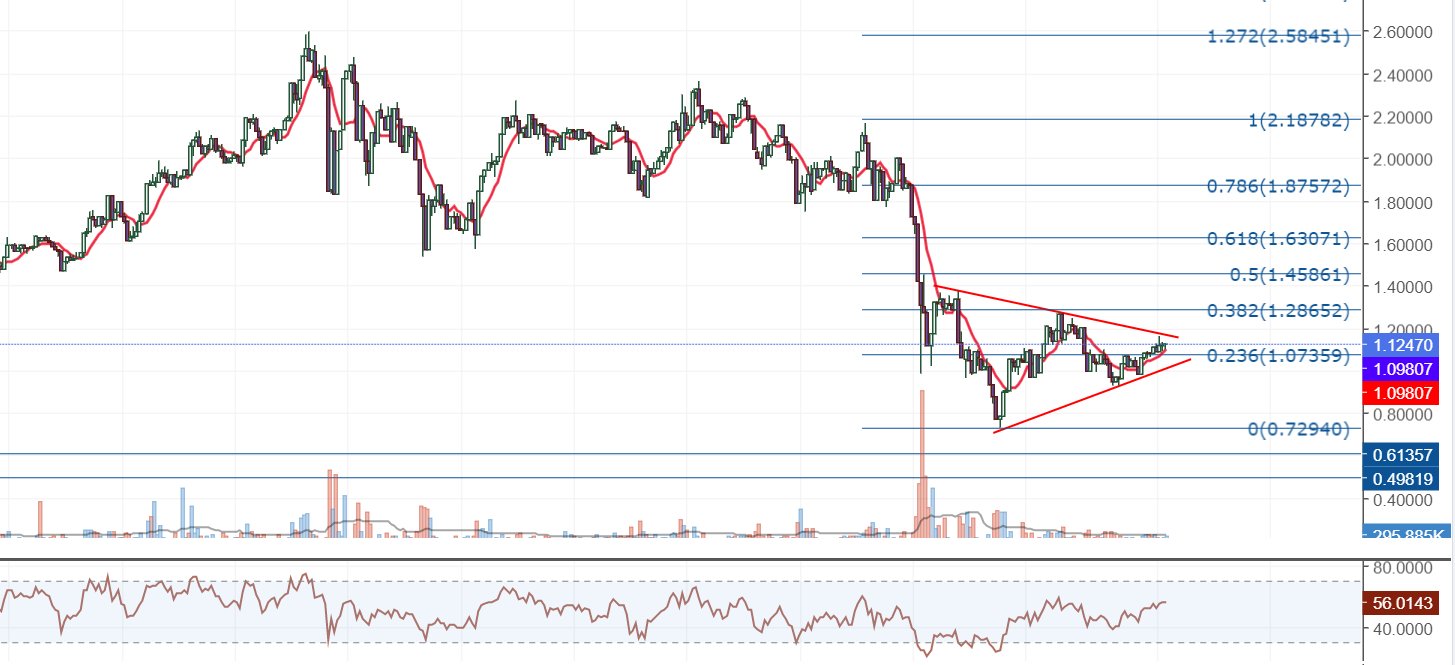 1,0000 desteğinin üzerinde tutunmaya çalışan IOTA 4 saatlik grafikte aşırı alım bölgesine geçiş yaptı. Hacminde zayıflama görülen kripto para birimi 1,2865 direncinden formasyon onayı alabilirse 1,8757’ye kadar ivme görülebilir. Bu durumda direnç seviyelerinin kademeli olarak takip edilmesinde yarar görülüyor.