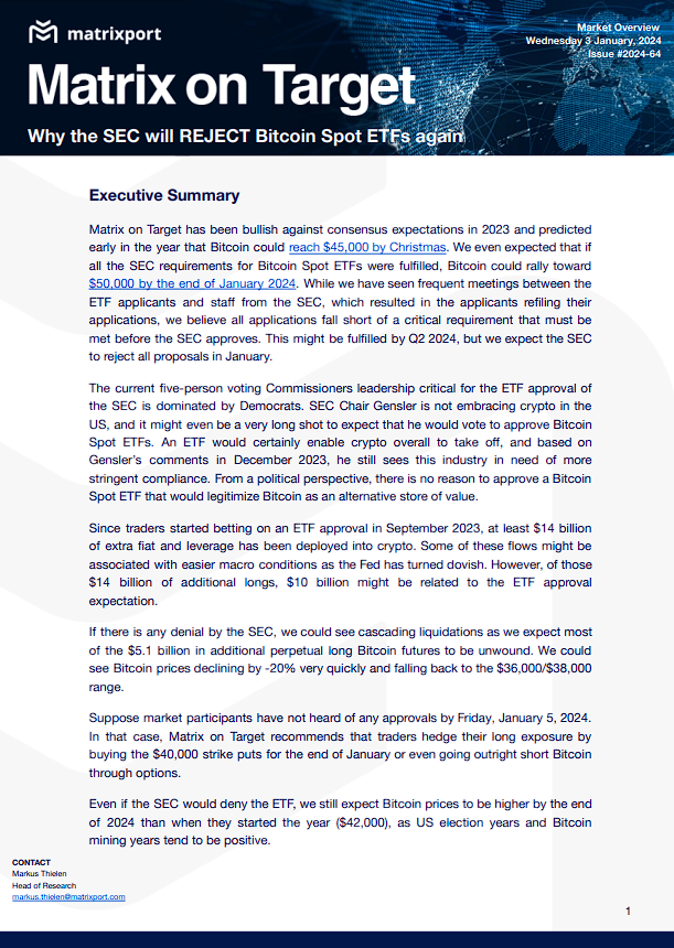 “Matrix on Target, Bitcoin’in yılsonuna kadar 45.000 dolara ulaşabileceğini öngördü. Hatta Bitcoin Spot ETF’leri için tüm SEC gereksinimlerinin karşılanması durumunda, BTC’nin Ocak 2024 sonuna kadar 50.000 dolara kadar çıkabileceğini bekledik.