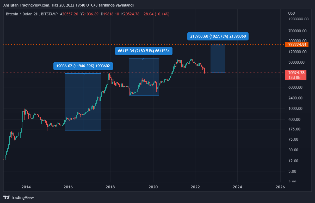 Birçok yatırımcı 220 bin doları uçuk bir hedef olarak tanımlasa da, aslında Bitcoin‘in diğer boğa döngülerinde yaşadığı yükselişlerine benzer bir hareket sergilemesi halinde çok rahat ulaşabileceği bir nokta.