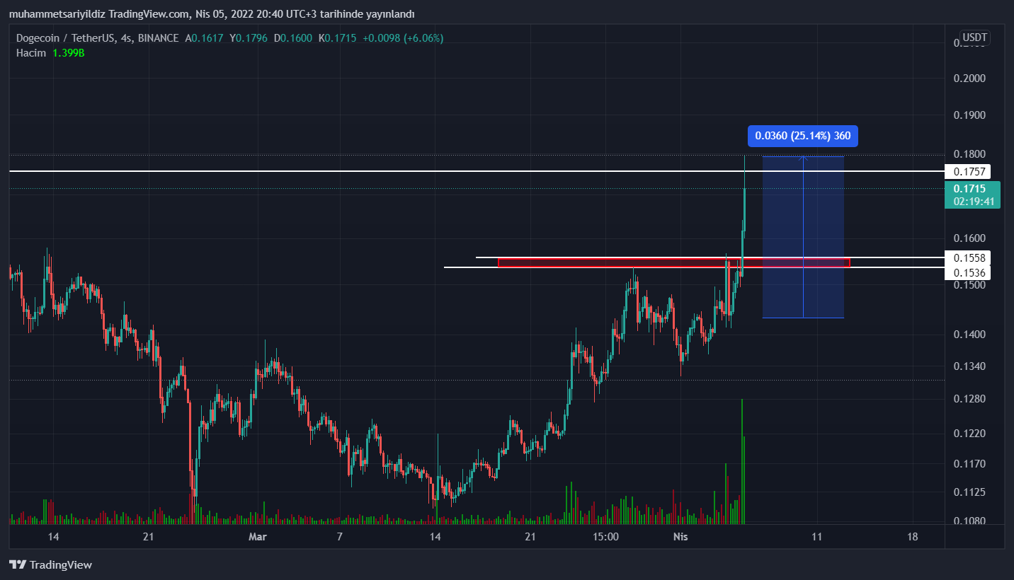 An itibariyle kritik bir direnç noktasına ulaşan Dogecoin, ilerleyen saatlerde 0.1757 dolar direnç seviyesini kırmasıyla birlikte yükselişe devam etmesi bekleniyor.