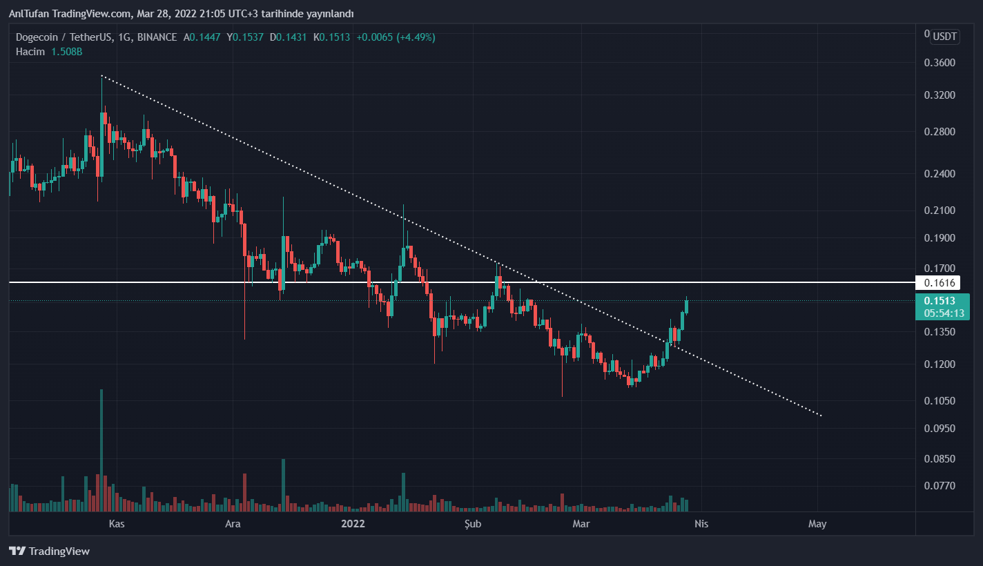 Düşen trendini kırmasının ardından sert bir şekilde yükselmeye başlayan DOGE, haberimizin yazıldığı esnada 0.1510 dolar seviyelerinden işlem görüyor.