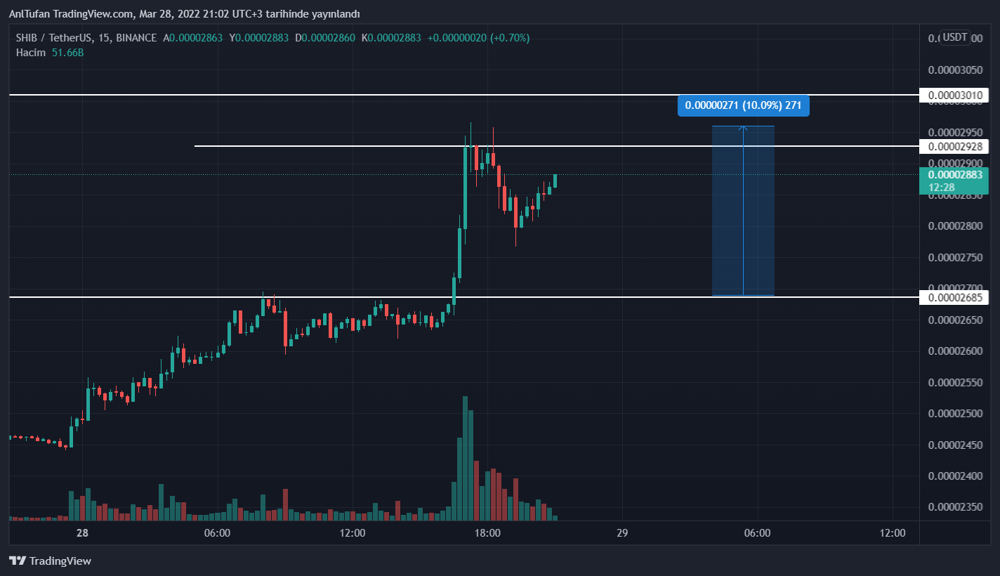 Bu düşüş sonrasında tekrar alıcı baskısıyla birlikte 0.00002860 dolar seviyelerine yükselen SHIB, şuan itibariyle 0.00003000 dolarda bulunan direnç seviyesine kadar değer kazanması bekleniyor.