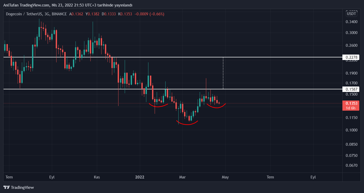 TOBO formasyonu oluşturan DOGE, ilerleyen süreçte 0.1587 dolar direncini aşmasıyla birlikte yükselişine başlayabilir.