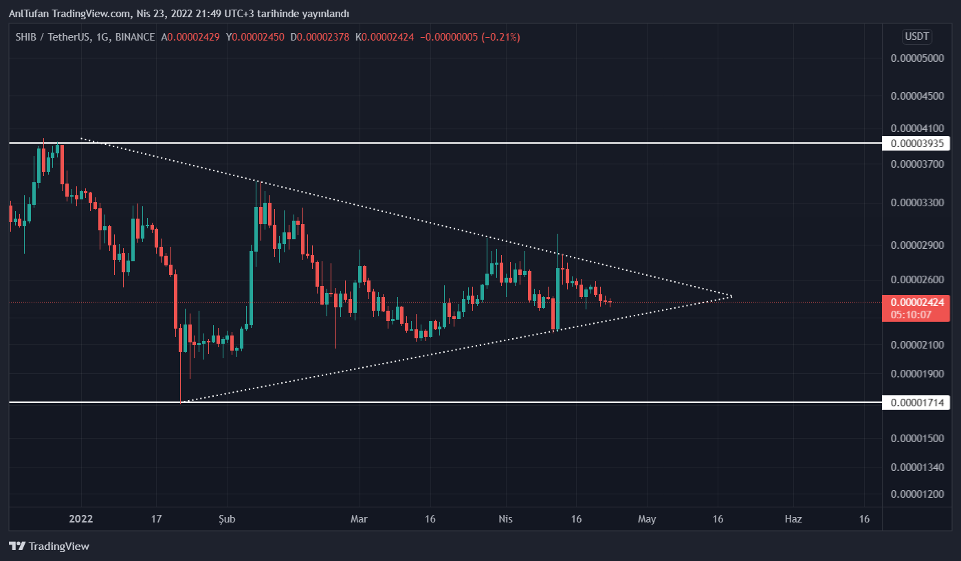 Yayın saati itibariyle 0.00002420 dolar seviyelerinde bulunan Shiba Inu, halen üçgen formasyonun içinde hareketlerini sürdürmekte.