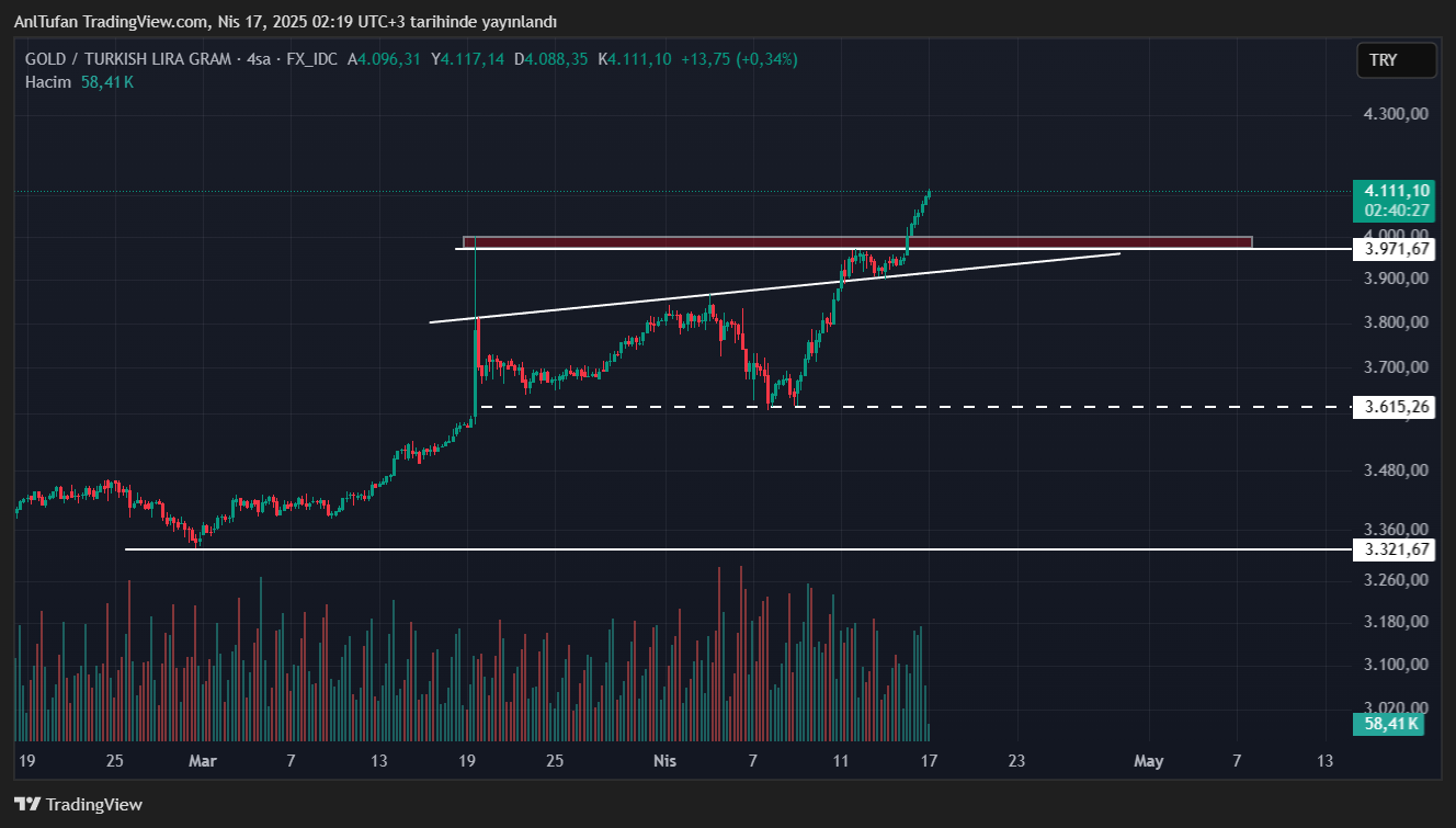 Gram altının yükselişlerine devam etmesi durumunda 4.200 TL seviyelerini hedeflemesi bekleniyor. TCMB’den bir faiz artış hamlesi gelmesi halinde ise gram altın 3.971 TL seviyesindeki desteğe gerileyebilir.