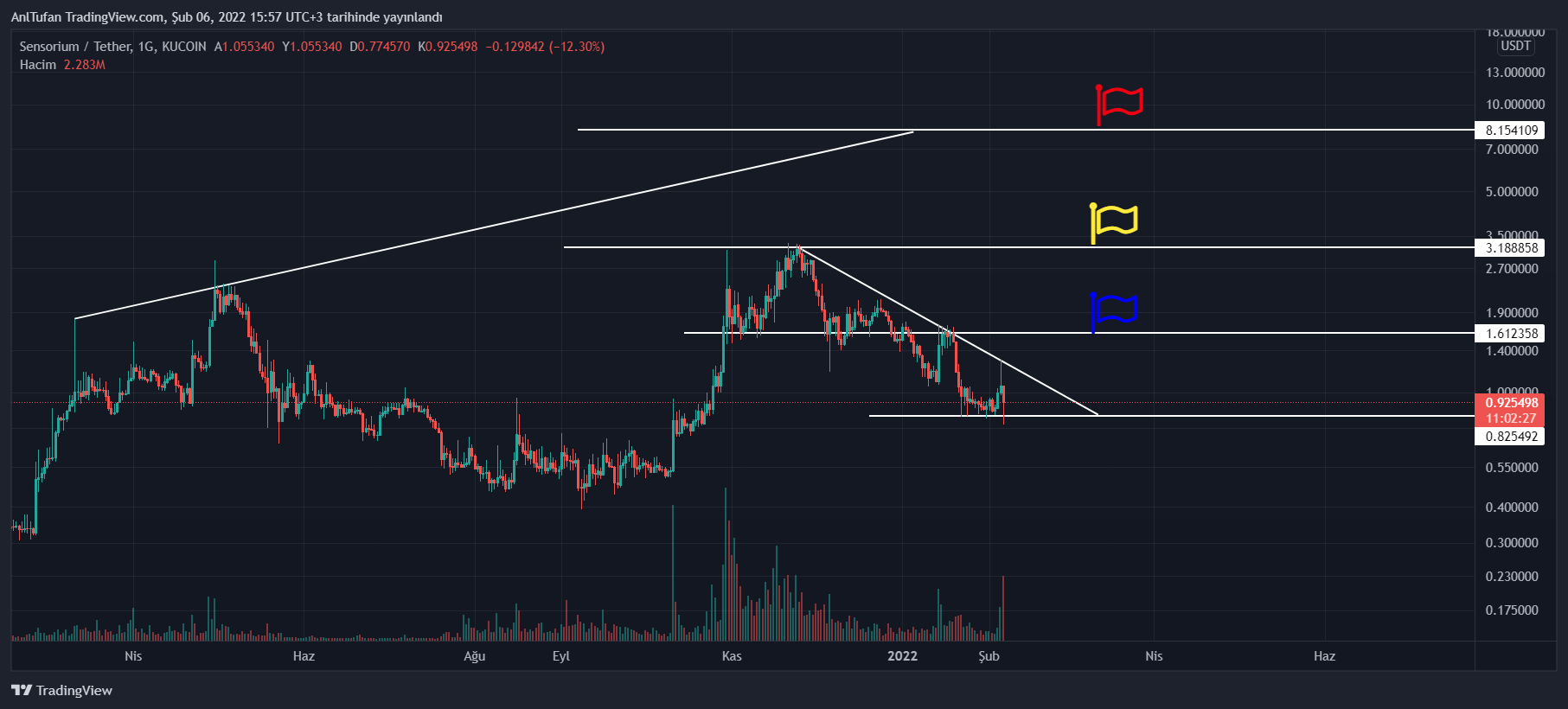 Düşen trendini kırması durumunda çok volatil mumlar ile yükselebilecek olan SENSO, ATH seviyesinden %71 oranında düşüş yaşadı. Trend kırılımı ardından SENSO, kısa vade hedefi olarak grafiğimizde belirttiğimiz mavi bayrak seviyesi olan 1.61 dolara bir yükseliş yaşayabilir.