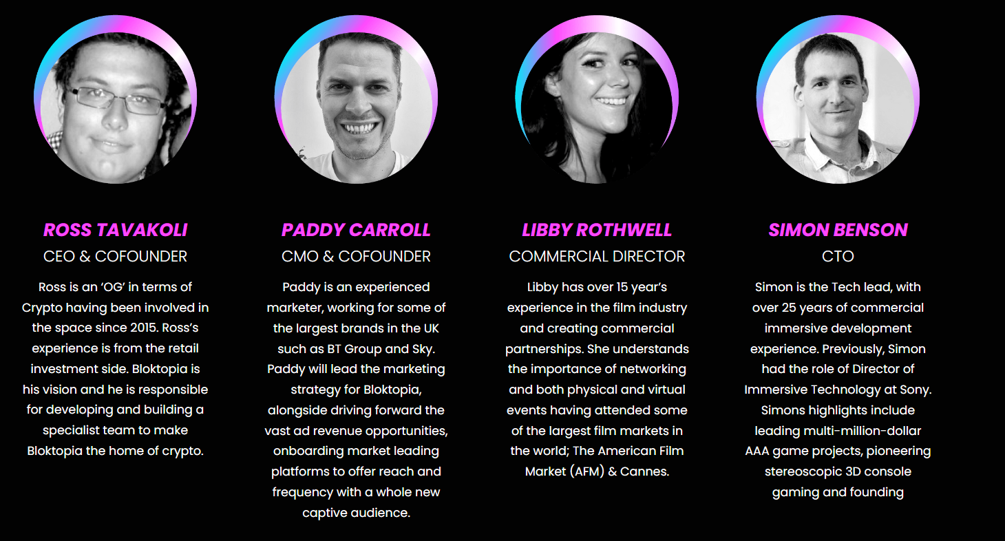 Bloktopia‘nın ekibinde 4 isim ön plana çıkıyor. Ross Tavakoli ve Paddy Carroll, projenin kurucuları olarak görülmekte. Bu isimlerin 2015’den beri sektörde olması dikkat çekiyor.