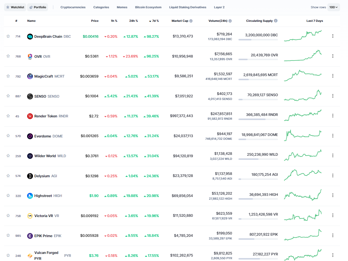 Başarılı bir veri sağlayıcısı olan CoinMarketCap’in aktardıklarına göre son 1 haftalık süreçte 2 adet metaverse altcoin’i yüzde 100’e yakın bir yükseliş yaşayarak değerini 2’ye katladı.