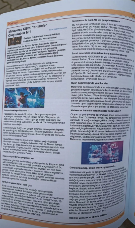 Üsküdar Üniversitesi Kurucu Rektörü Doktor Nevzat Tahran’ın açıklamalarını konu alan başlık, metaverse’ün insan üzerinde büyük sorunlara yol açtığına dile getirmekte.