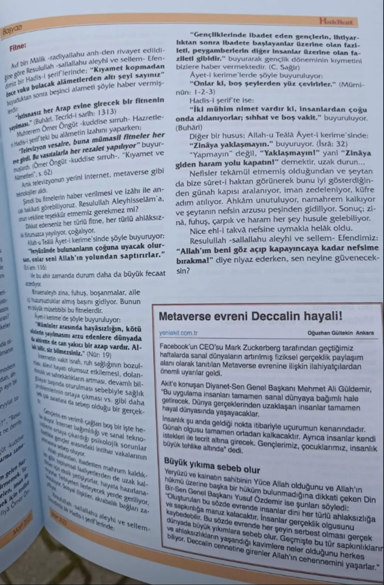 Hakikat yayıncılığın bu ayki çıkarttığı dergisinde kritik başlıklar yer almakta. Metaverse teknolojisinin İslam‘a ters olduğunu düşünen yayıncılık, bu konu ile ilgili iki tane kritik başlık atmış durumda.